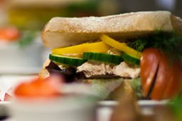 4 håndmadder med æg og tomat, leverpostej med rødbede, rullepølse med løg og brieost med peberfrugt